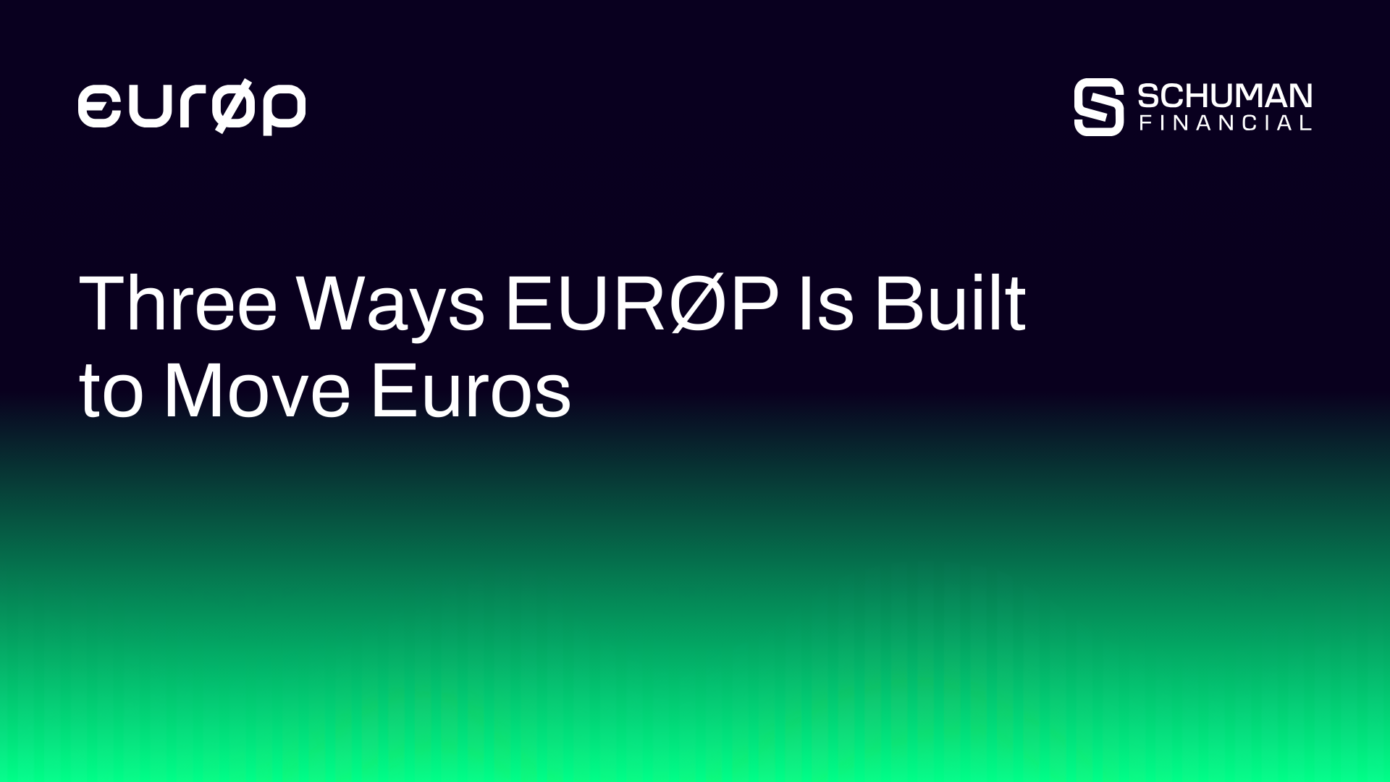 This communication is provided by Salvus SAS, an authorised EMT issuer in France, which trades under the name Schuman Financial. Detailed information about the electronic money tokens (“EMT”) we issue, including the EURØP stablecoin, can be found in the published White Papers available on our website. Token holders are entitled to redeem EURØP directly from the issuer at any time at face value.
